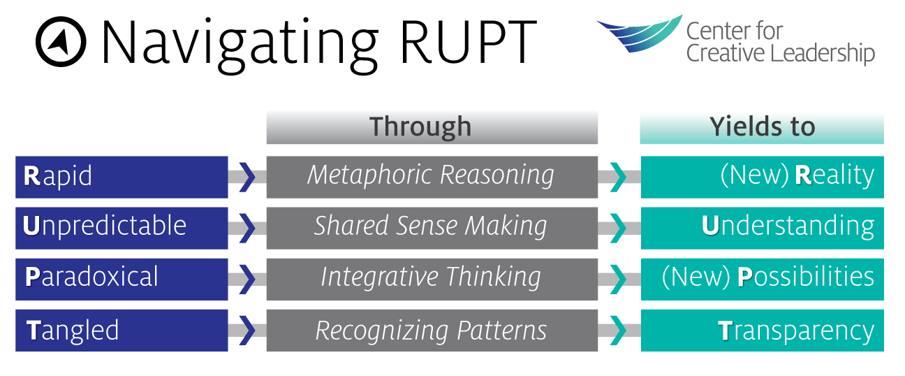 In response, we tapped our own knowledge and research at CCL about leading in complexity and developed an acronym that more readily connects the experience of disruption with the leadership necessary to navigate it.