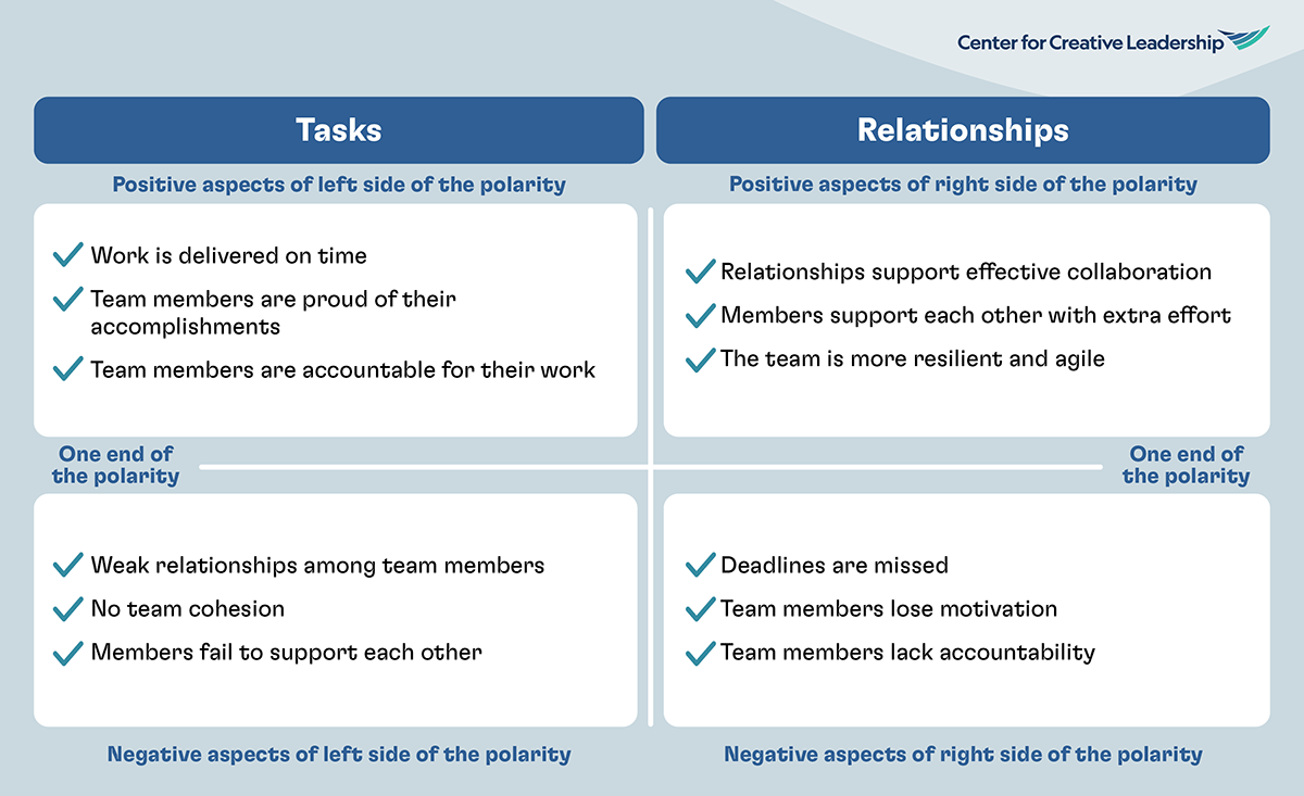 Here’s an example of a Tasks and Relationships polarity map, exploring a common unsolvable tension faced when leading virtual teams, as we explored in another white paper. Using this tool, you can easily see both the positive and negative consequences of each side of the pair, which shows why virtual teams are most successful when they have both a task focus and a relationships focus.