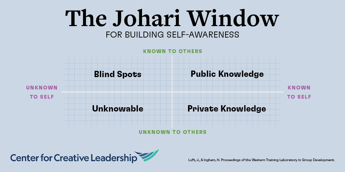 Before you can begin increasing your self-awareness, it’s helpful to understand the differences in how you see yourself vs. how others see you. The Johari Window is a constructive, research-based tool that helps you organize your self-awareness into a 2-by-2 grid, with the 4 parts representing what is known and unknown about you to other people, and what is known and unknown about you to yourself: