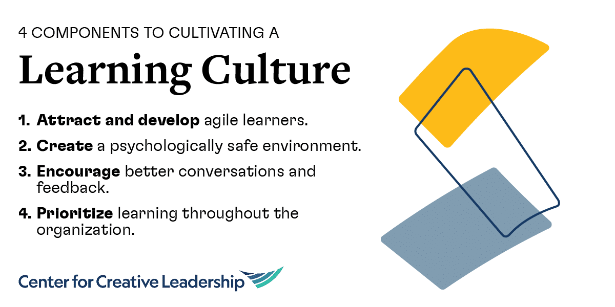 How do you cultivate a learning culture?There are 4 key components to building a learning culture, including attracting and developing agile leaders, creating a psychologically safe environment, encouraging better conversations and candid feedback, and prioritizing learning throughout the organization. Finally, organizations must develop a learning culture that’s tailored to their unique challenges and context, ensuring that their learning strategy aligns with their business strategy as well as their values, brand, and development goals.