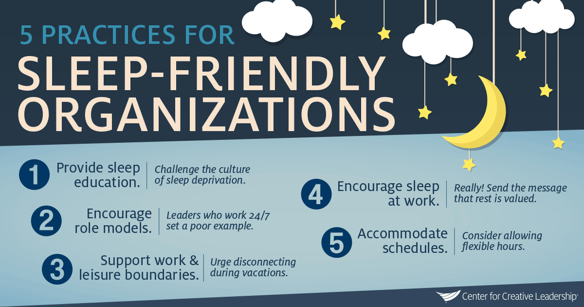 - Encourage senior leaders to bring up the sleep challenges that teams face and discuss possible solutions in routine meetings or trainings. Leaders can be transparent about their own choices to get more rest: sharing that they declined a late dinner after a day of travel so that they could be well-rested for an important morning presentation, for example. Candidly bringing up the issue and creating space for teams to discuss it openly creates and reinforces greater psychological safety at work.
